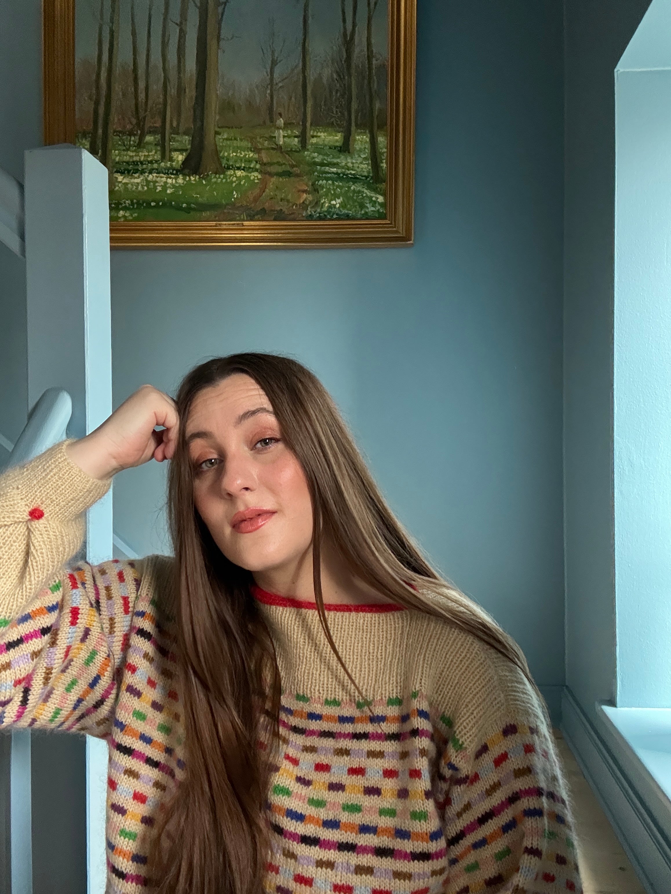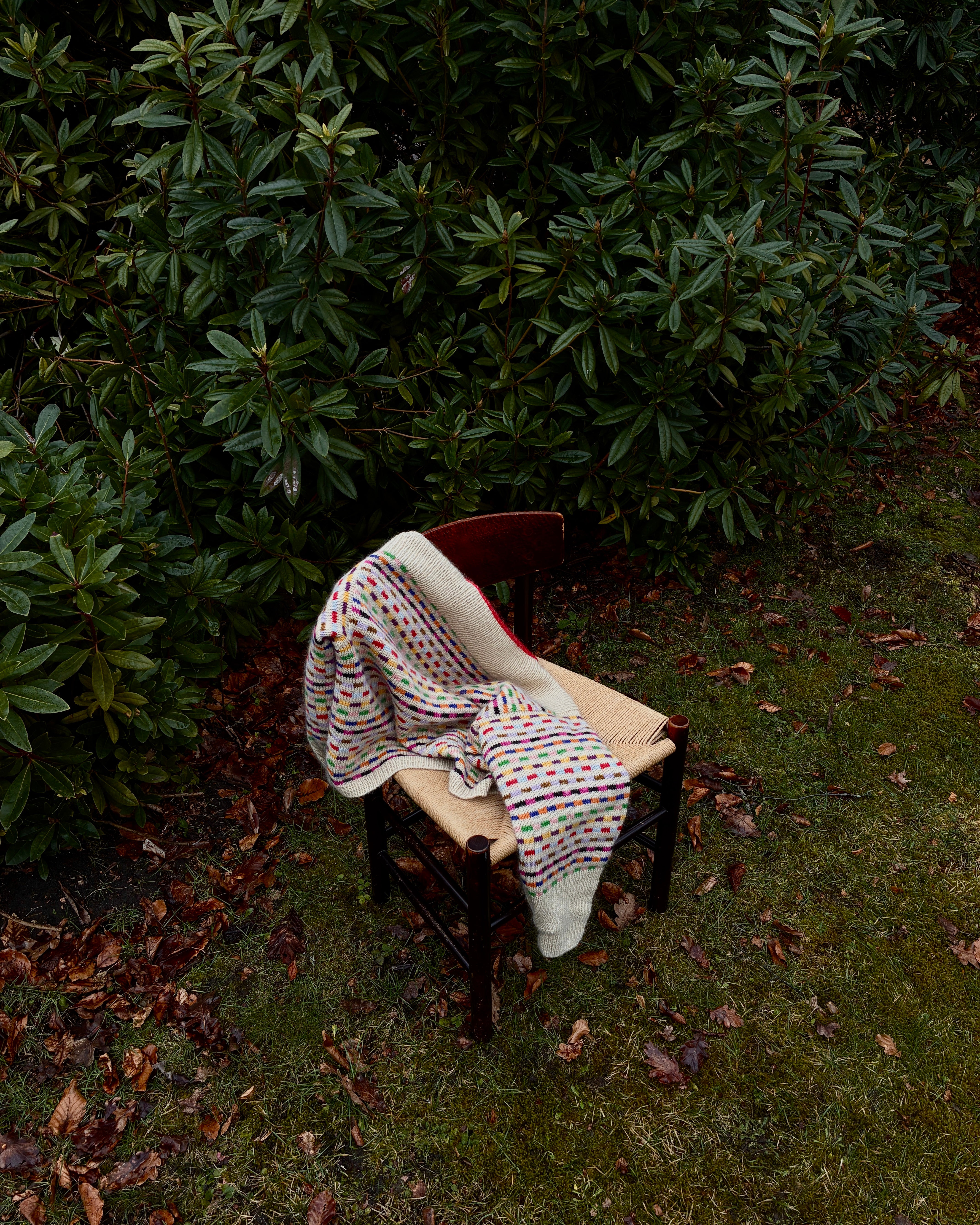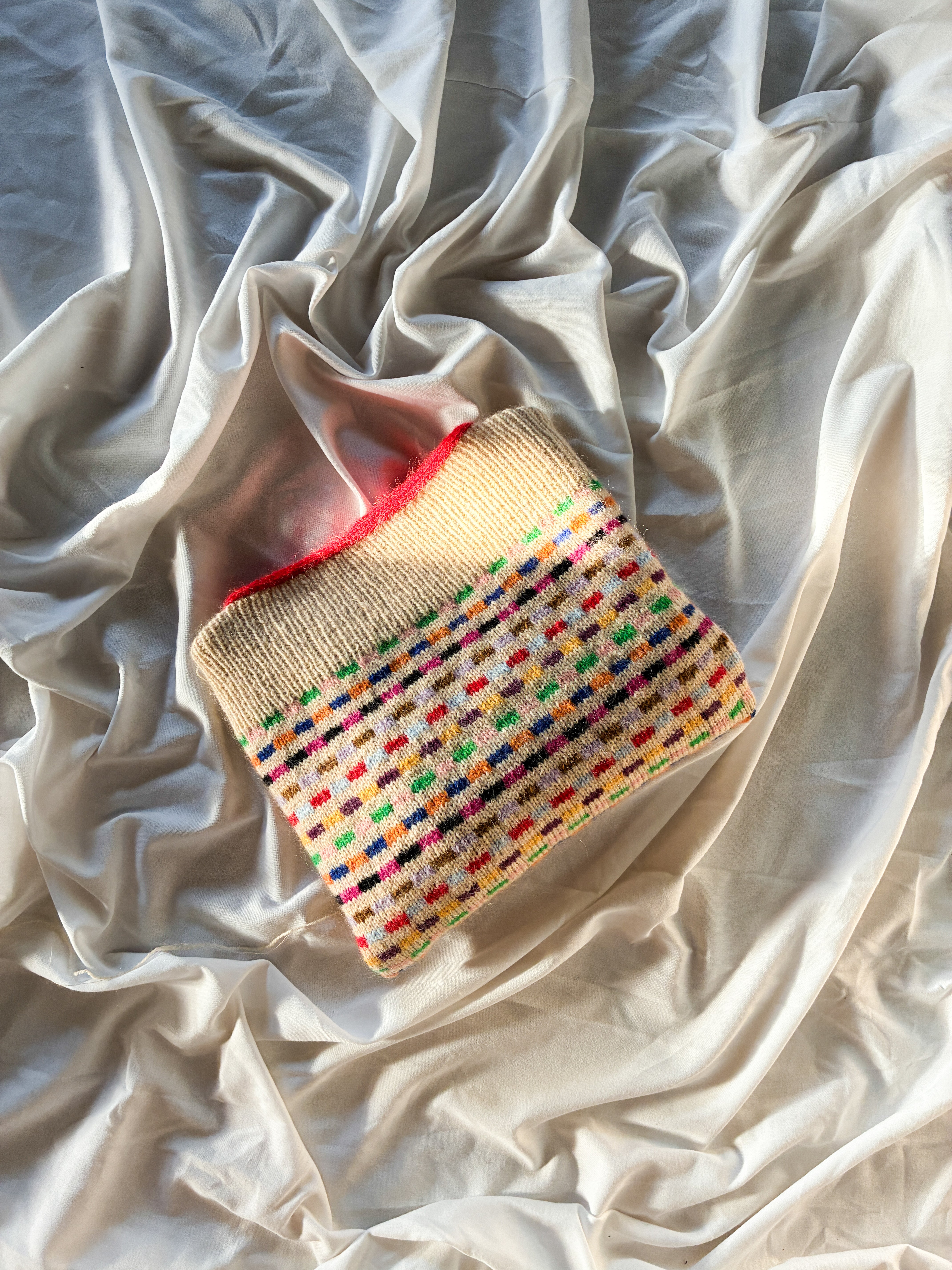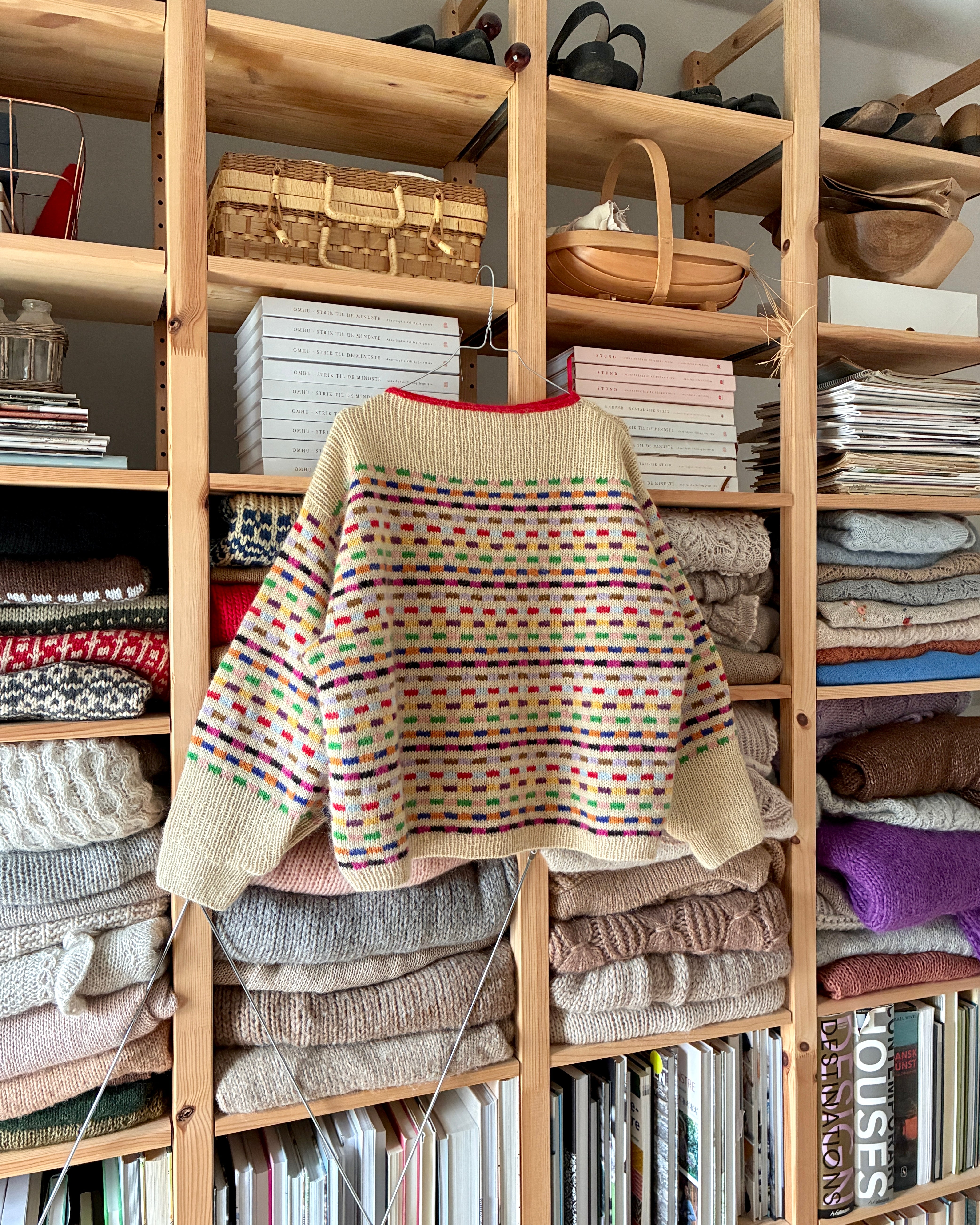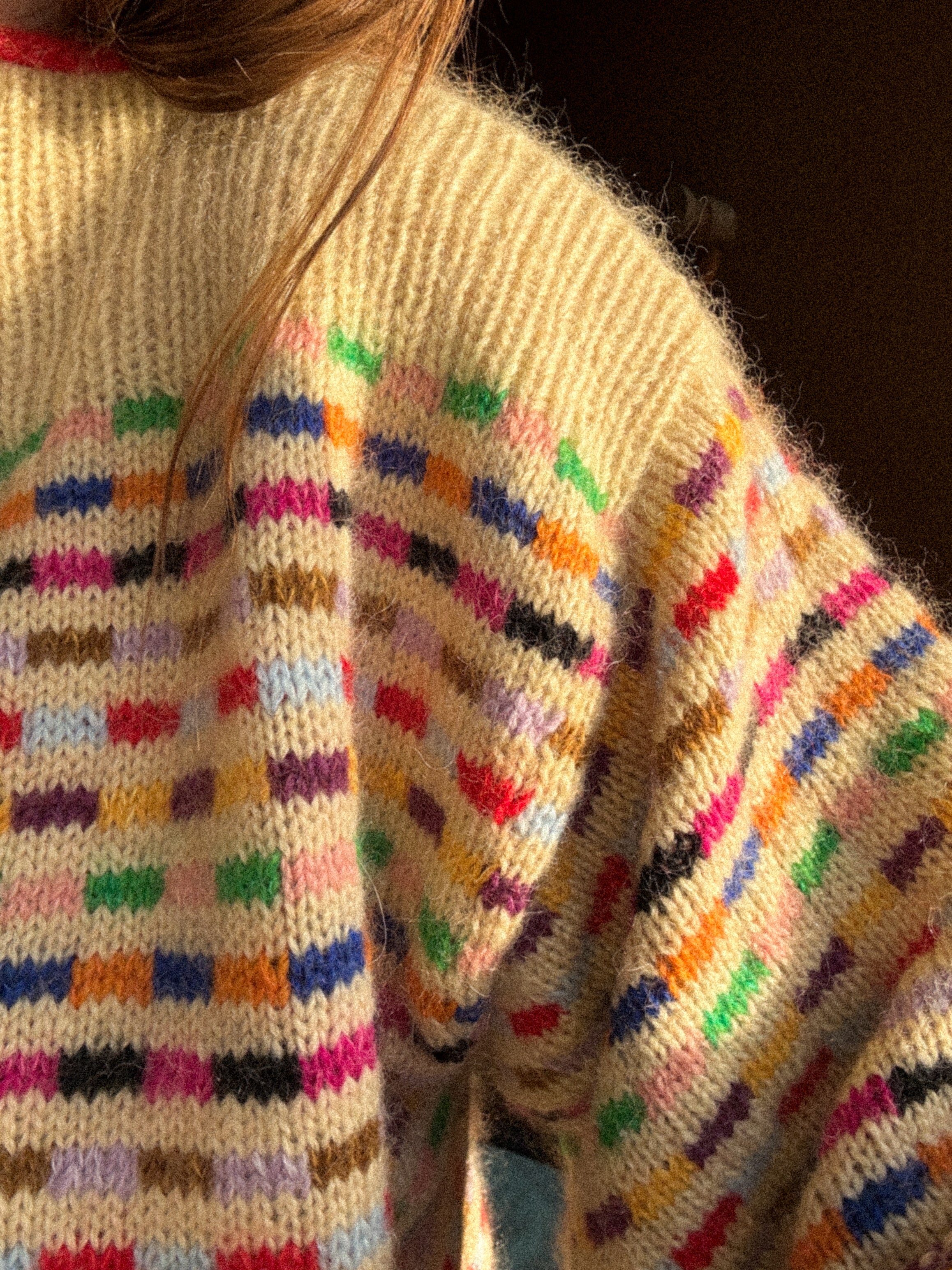 Garn: Genseren strikkes med 2 tråder holdt sammen, i hver av de 13 anvendte fargene.