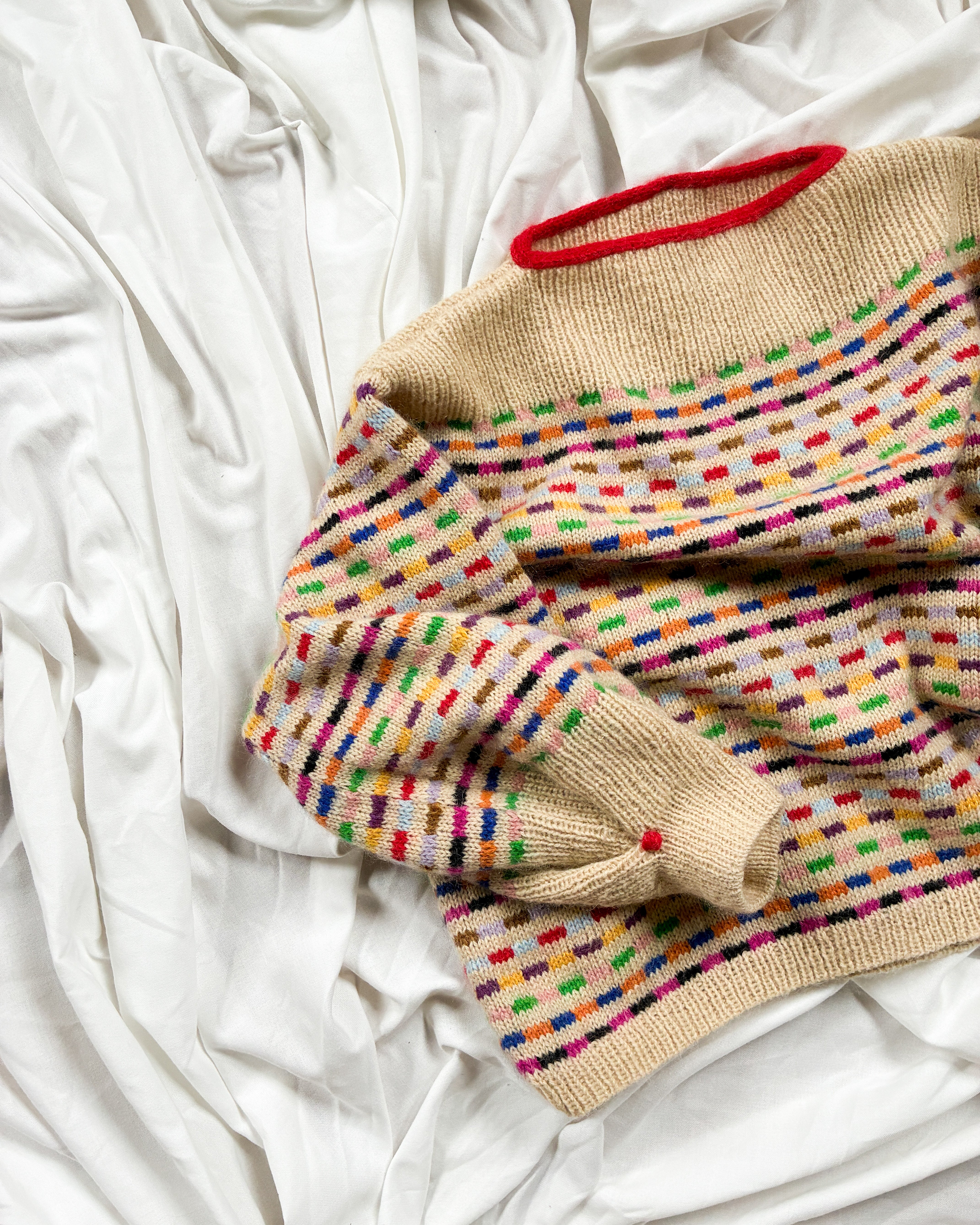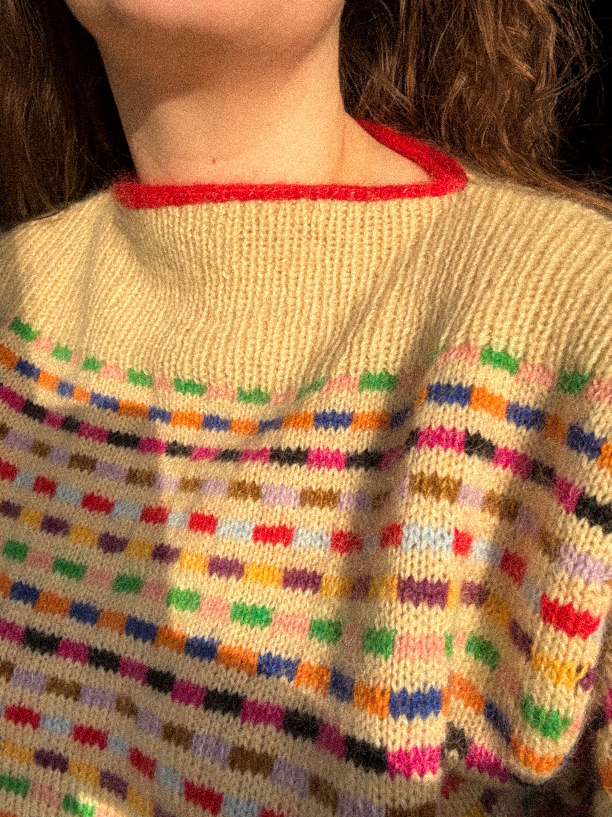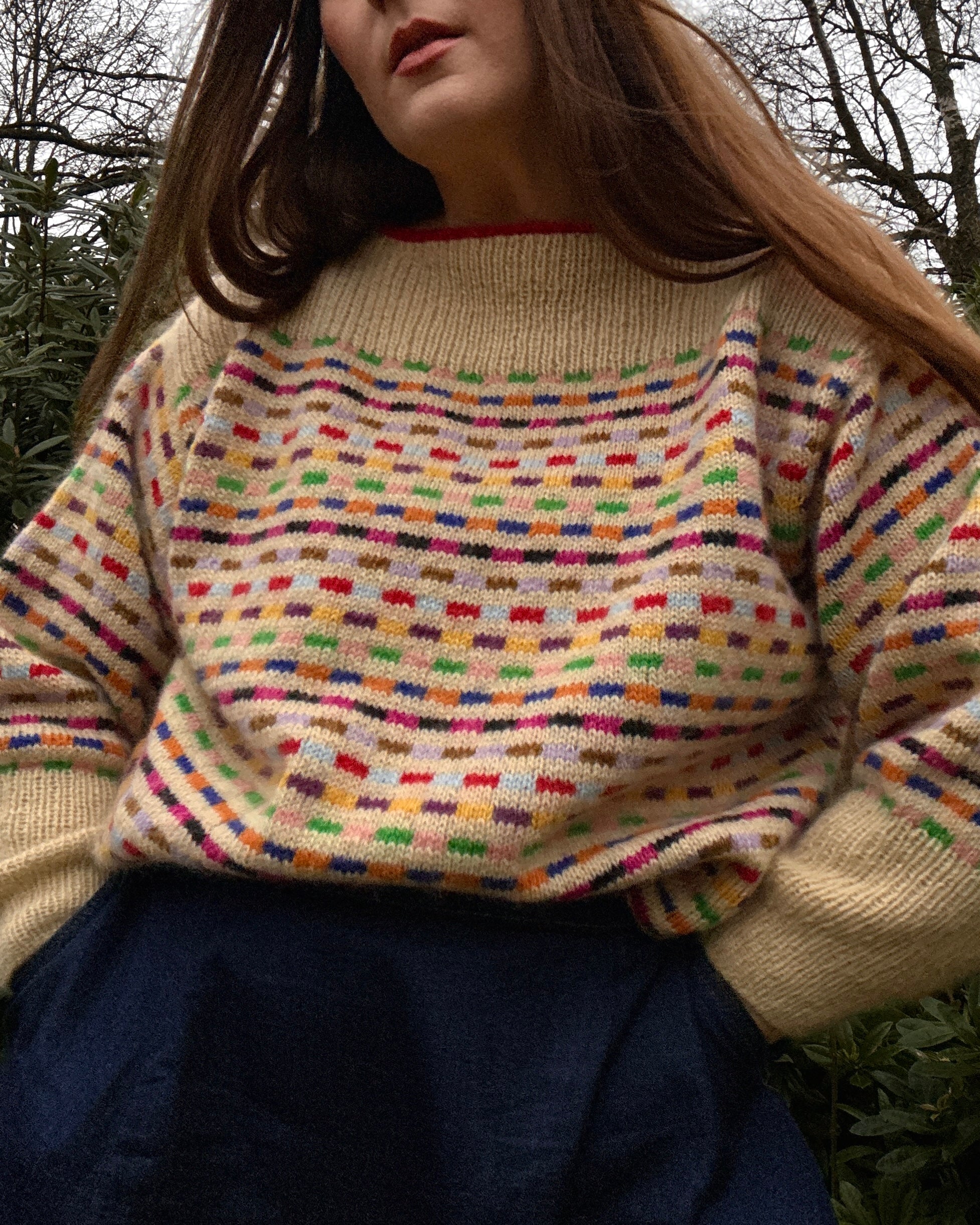 Genserens multifargede stripemønster strikkes ut fra et diagram, og underveis er det viktig å følge anvisningene for dominans for å sikre den rette fargestrukturen opp langs hele arbeidet. Segmenter av ribb anvendes til både kanter og bærestykke, og halskanten avsluttes av en påstrikket I-cord, mens hvert erme ferdiggjøres av en box pleat i ribb.