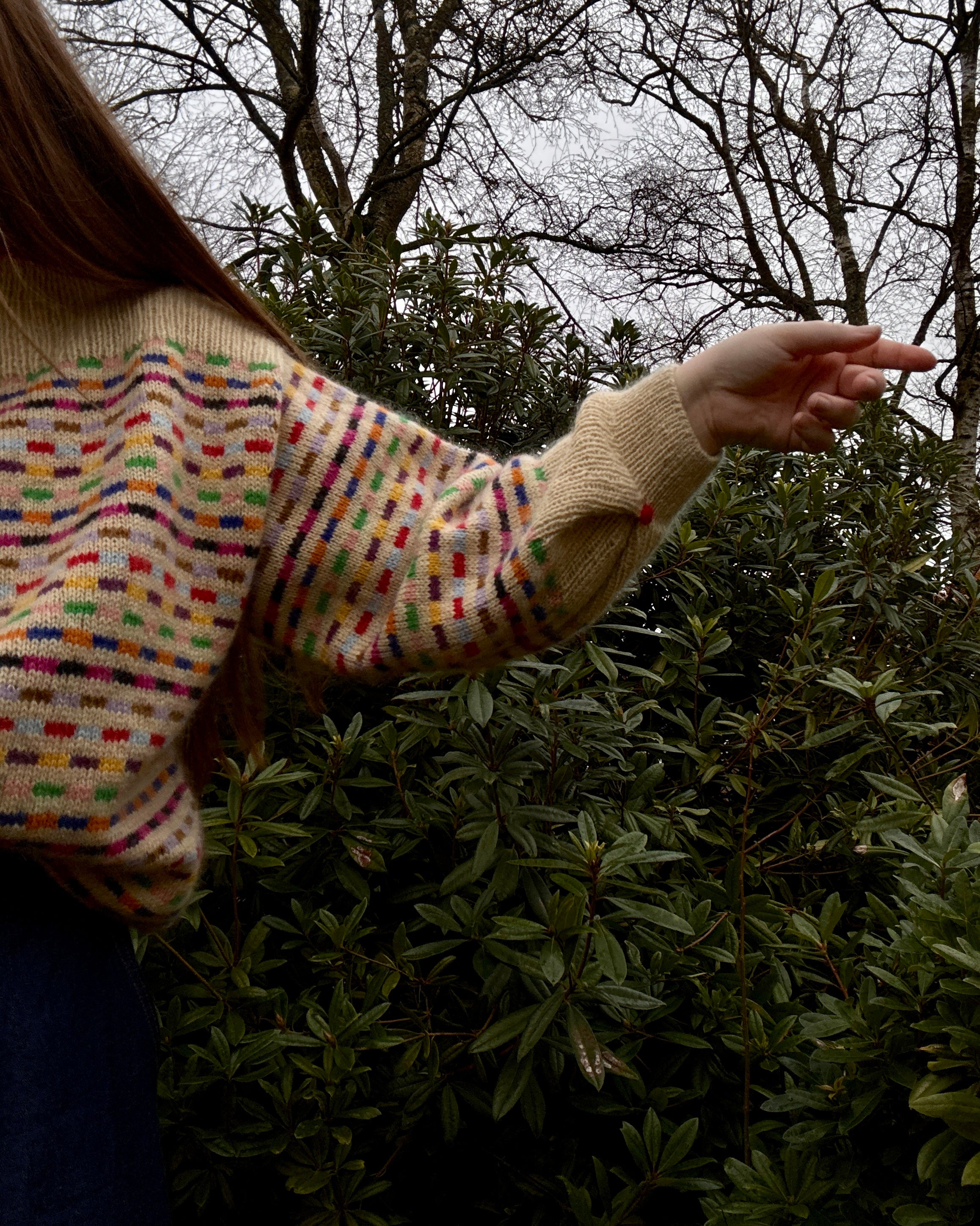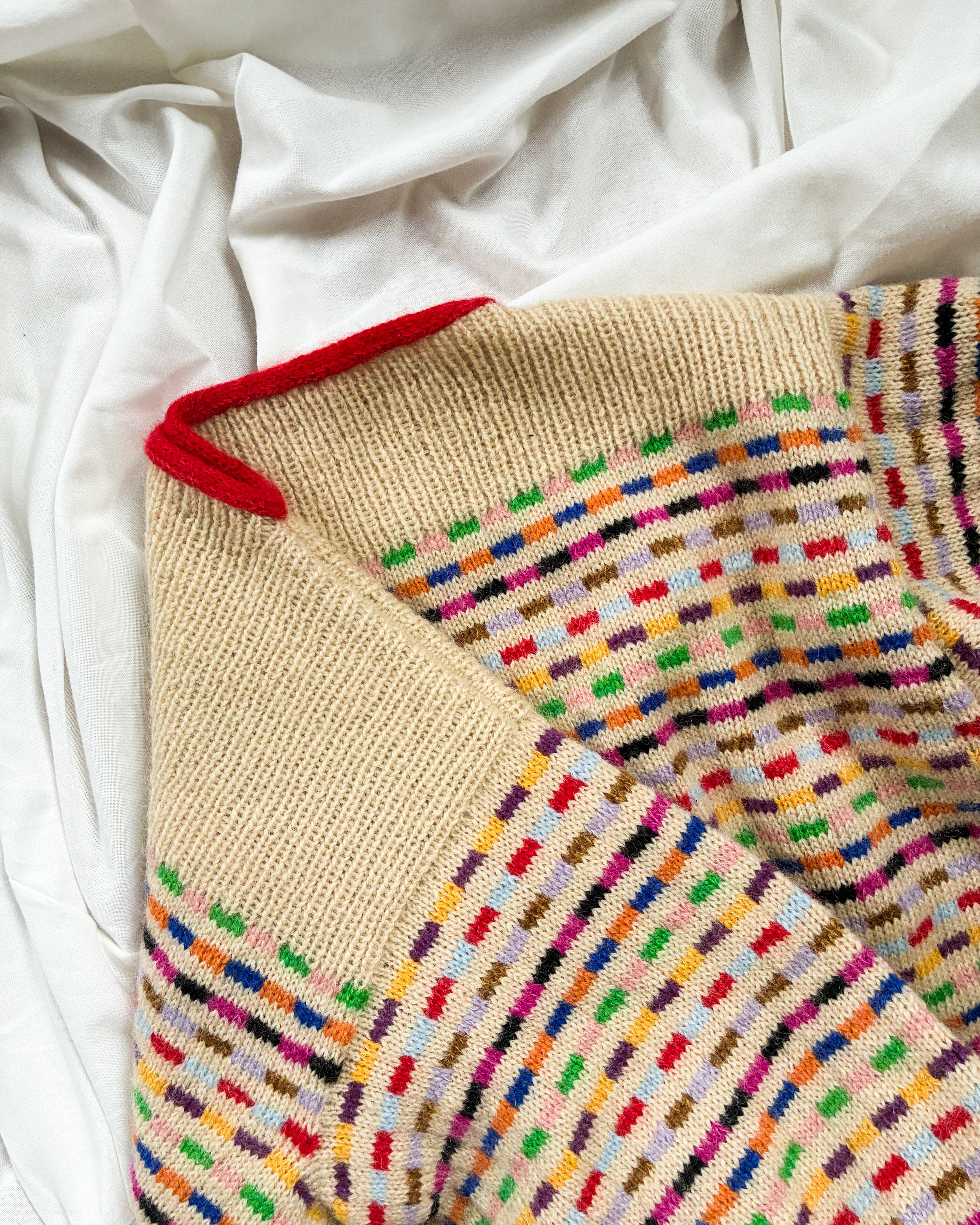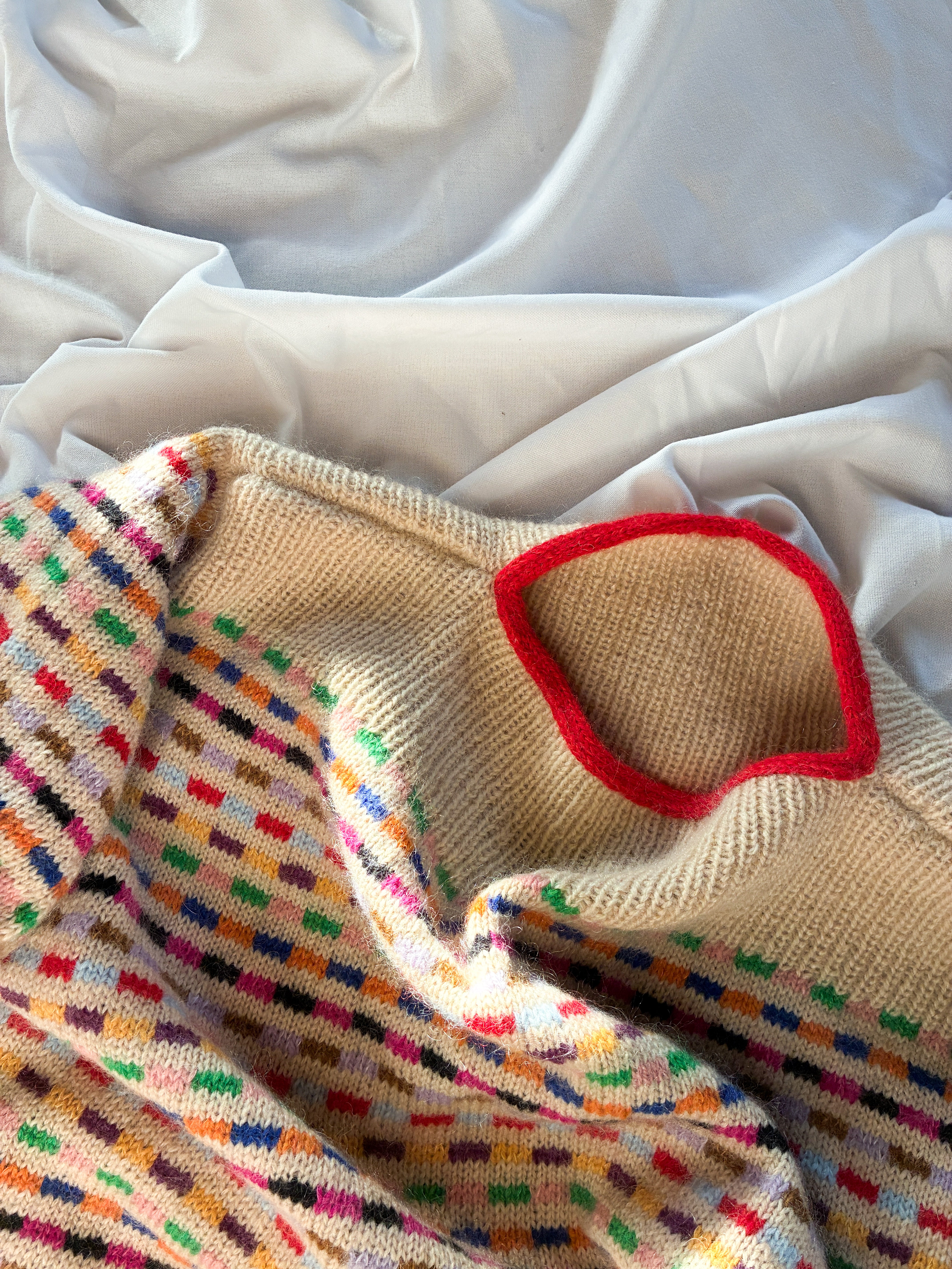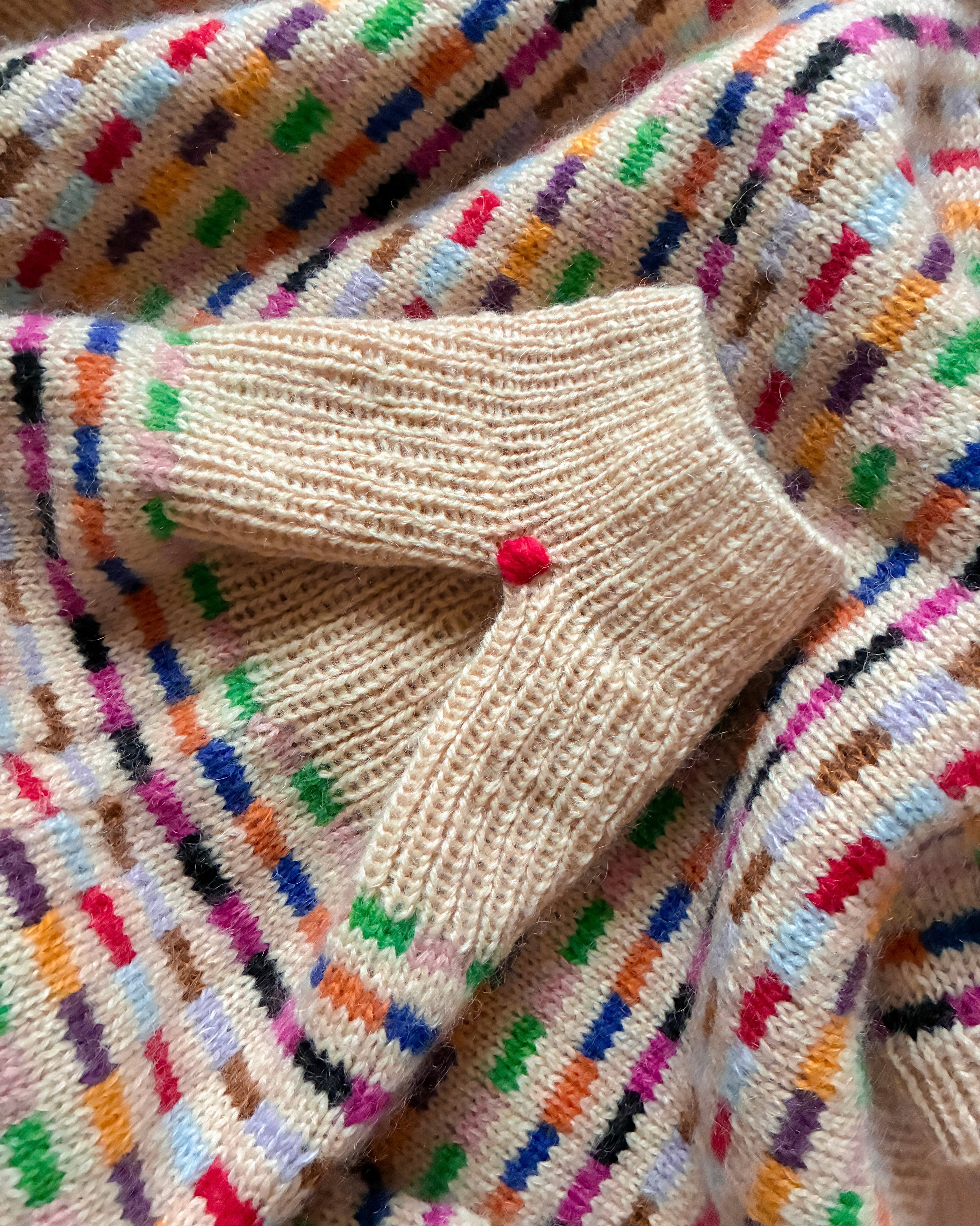 Genserens multifargede stripemønster strikkes ut fra et diagram, og underveis er det viktig å følge anvisningene for dominans for å sikre den rette fargestrukturen opp langs hele arbeidet. Segmenter av ribb anvendes til både kanter og bærestykke, og halskanten avsluttes av en påstrikket I-cord, mens hvert erme ferdiggjøres av en box pleat i ribb.